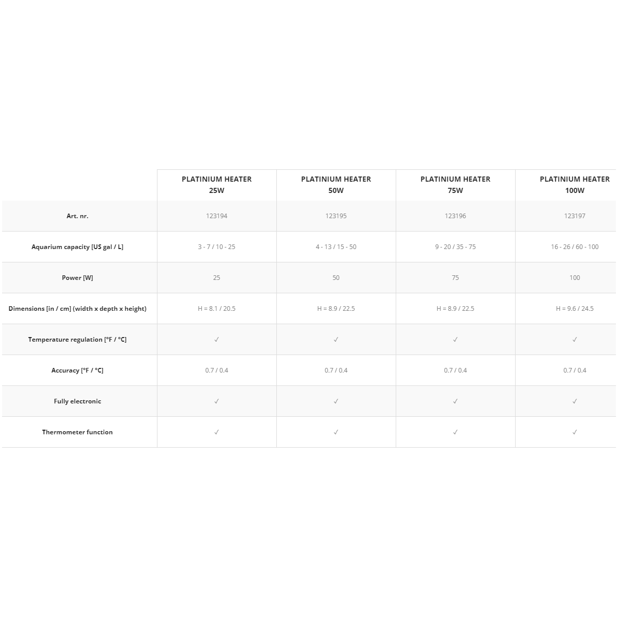 گرمکننده پلاتینیوم دمای آب در آکواریوم را با دقت +/- 0.7 درجه فارنهایت [0.4 درجه سلسیوس] حفظ میکند. این دستگاه دارای ترمواستات کاملاً الکترونیکی است (بدون قطعات قابل خرابی مانند ترمواستاتهای مکانیکی) که قابلیت اطمینان از عملکرد آن را برای سالها تضمین میکند.