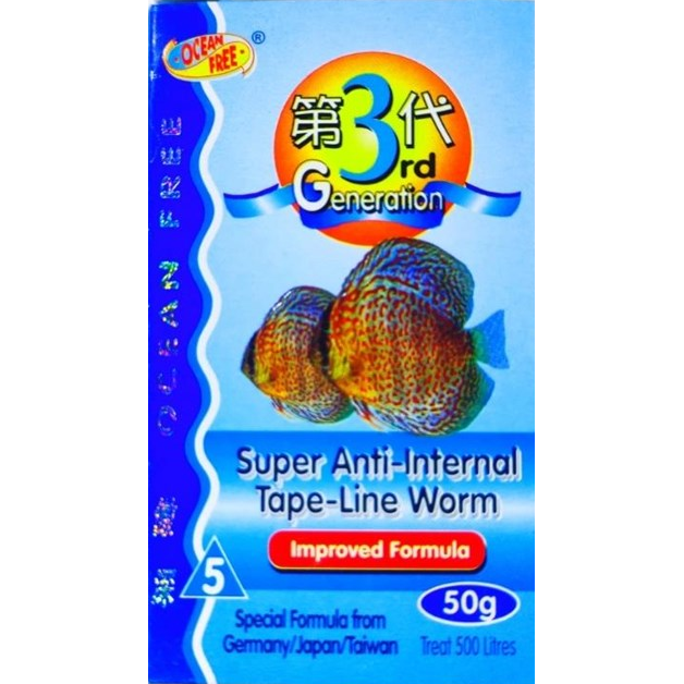 این محصول از اوشن فری درمان انگل های داخلی بسیار موثر و دارای فرمولی بهبود یافته است که کرمهای انگل و فلوکاهای داخلی را در دیسکس ها و ماهیان دیگر مانند ماهیان دورف از بین میبرد. علائم آن شامل از دست دادن اشتها، تورم شکم و حضور کرمهای نواری در مواد فضولی ماهیان است. وقتی دیسکس ها یا ماهیان دیگر کرمهای خونی یا توبیفکس تغذیه میشود، تخمهای انگل ممکن است در این کرمها وجود داشته باشند زیرا ممکن است از منابع آلوده به آنها انتقال پیدا کنند. این تخمها درون ماهی جوجه میشوند و باعث تورم شکمی میشوند. این دارو به طور موثر این کرمها را از بین میبرد. این درمان همچنین برای اکثر ماهیان آبشیرین (به استثنای ماهی آروانا) مناسب است و نباید برای ماهیان آبشور استفاده شود.