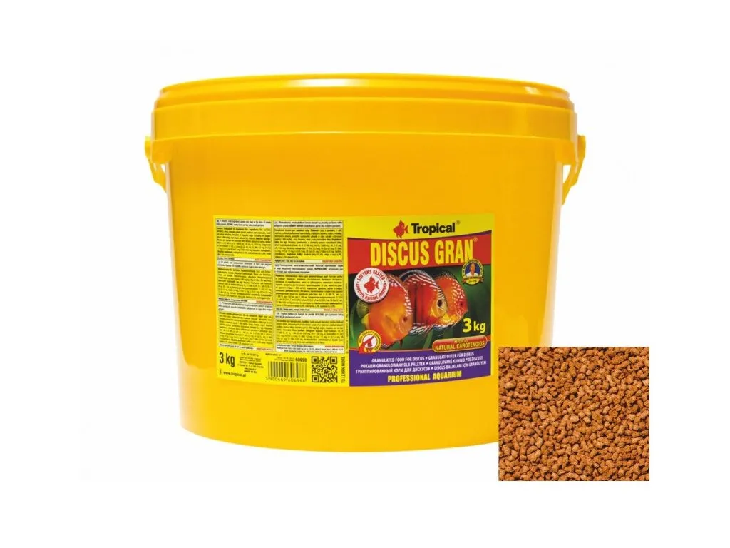 غذای گرانول دیسکس گران 3 کیلوگرم تروپیکال یک غذای کامل و مغذی برای ماهیان دیسکس آب شیرین است که به طور خاص برای تقویت رنگ، سلامتی و شادابی آنها فرموله شده است. این غذا به صورت گرانول ارائه می شود که برای مصرف آسان توسط ماهیان دیسکس مناسب است.