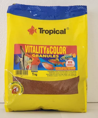 غذای گرانول تقویت رنگ ماهی ویتالیتی کالر تروپیکال یک غذای کامل و مغذی مخصوص ماهیان آب شیرین گرمسیری است که به طور خاص برای تقویت رنگ، سلامتی و شادابی آنها فرموله شده است. این غذا به صورت گرانول ارائه می شود که برای مصرف آسان توسط انواع ماهیان مناسب است.