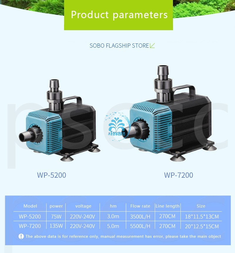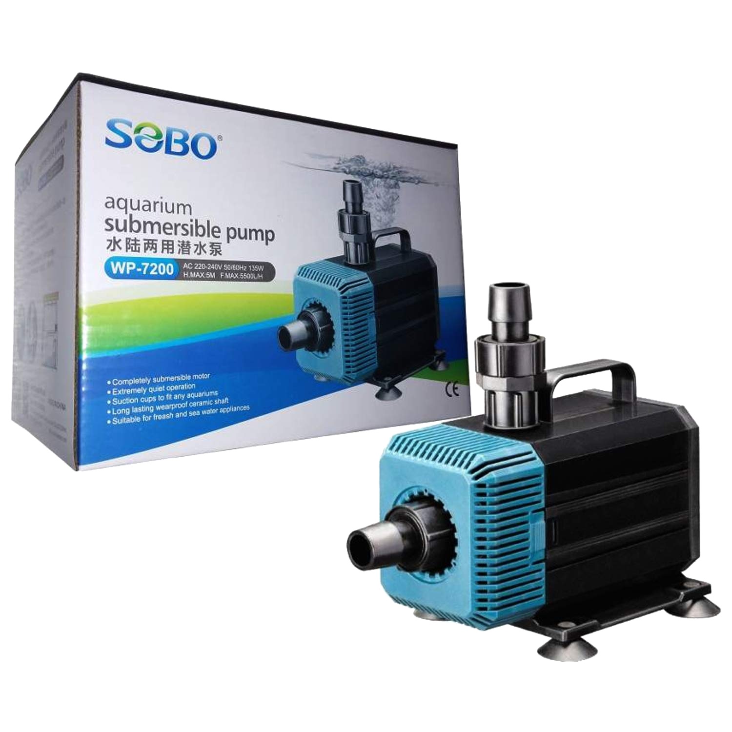 SOBO WP-7200 یک پمپ آب تر (غوطه ور) و خشک (با قابلیت نصب در بیرون از آب توسط شلنگ خارجی) است که با توان 135 وات و حداکثر جریان 5500 لیتر در ساعت است. این پمپ برای استفاده در آکواریوم های آب شیرین و آب شور، حوضچه ها و آبنماها طراحی شده است. WP-7200 دارای یک بدنه پلاستیکی و یک شفت سرامیکی است که آن را برای استفاده در آب های شور و شیرین مناسب می کند. WP-7200 یک پمپ آب با کیفیت و قابل اعتماد است که برای طیف گسترده ای از کاربردها مناسب است.