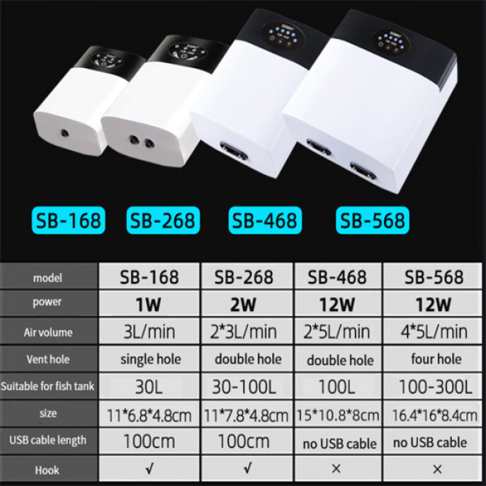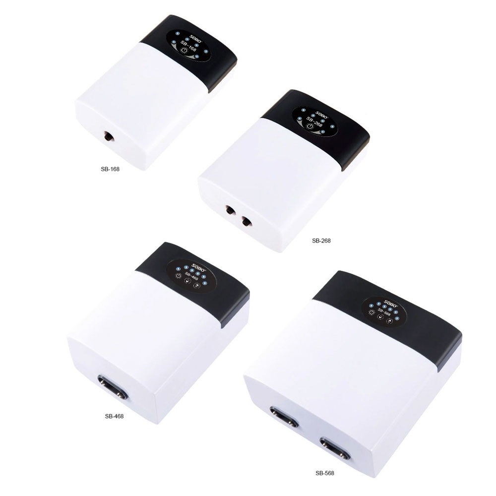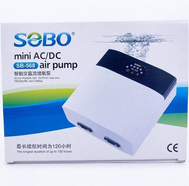 پمپ هوای شارژی چهار خروجی سوبو SOBO 568 یک پمپ هوا کوچک و قابل حمل است که برای آکواریوم های کوچک و متوسط ​​آب شور و آب شیرین طراحی شده است. این پمپ دارای چهار خروجی هوا است که می تواند برای توزیع یکنواخت جریان هوا در آکواریوم استفاده شود.